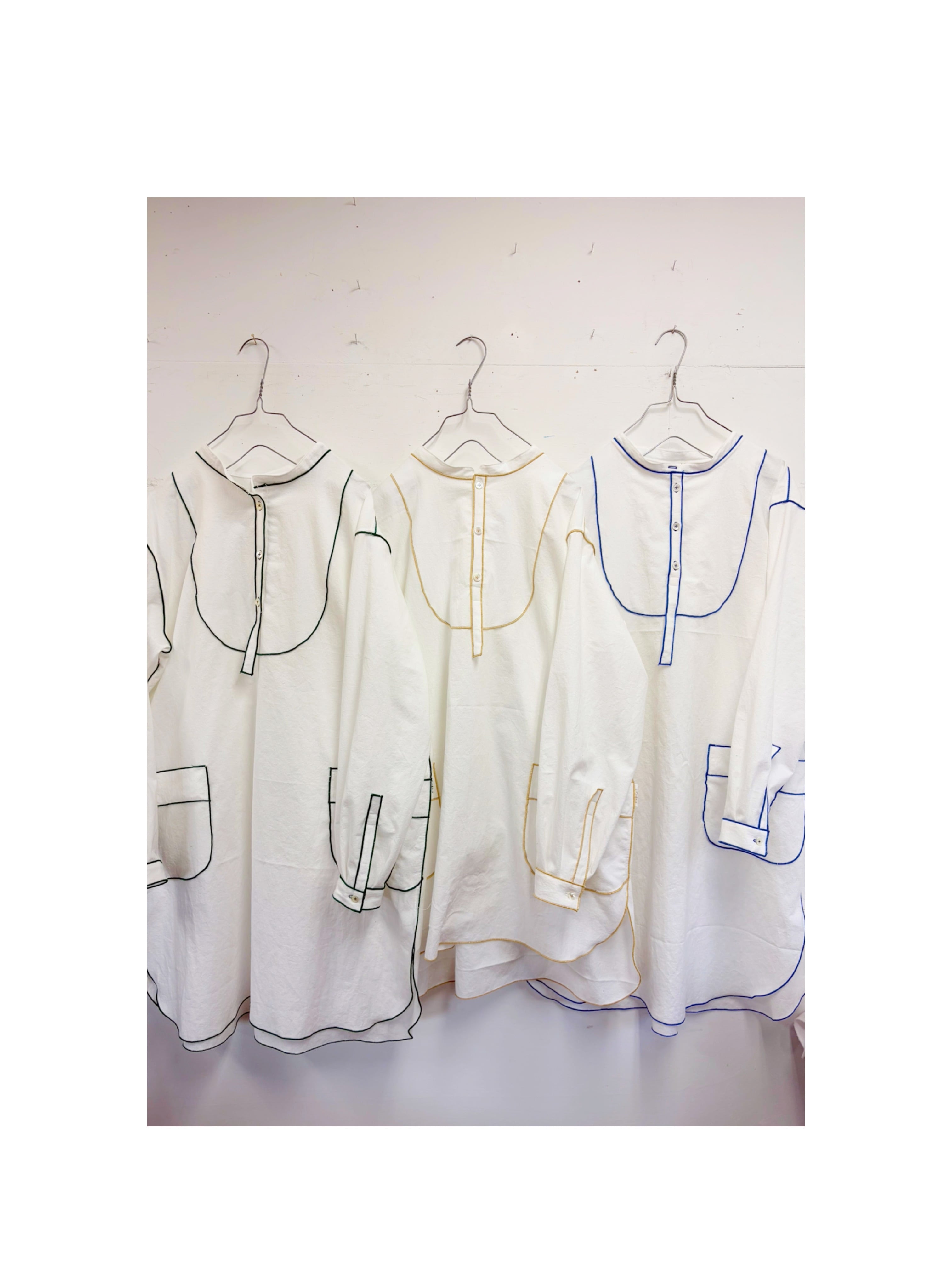 膝丈のロングシャツぐるりと縁取りました 絵の中から飛び出したようなシャツになりました。 後ろにタックを入れたのでゆったりとした着心地となっています。 縁取り 緑 素材 コットン サイズ 着丈90cm 裄丈80cm 身幅65cm 袖幅20cm 袖口22cm ボタンあり 襟ぐり48cm