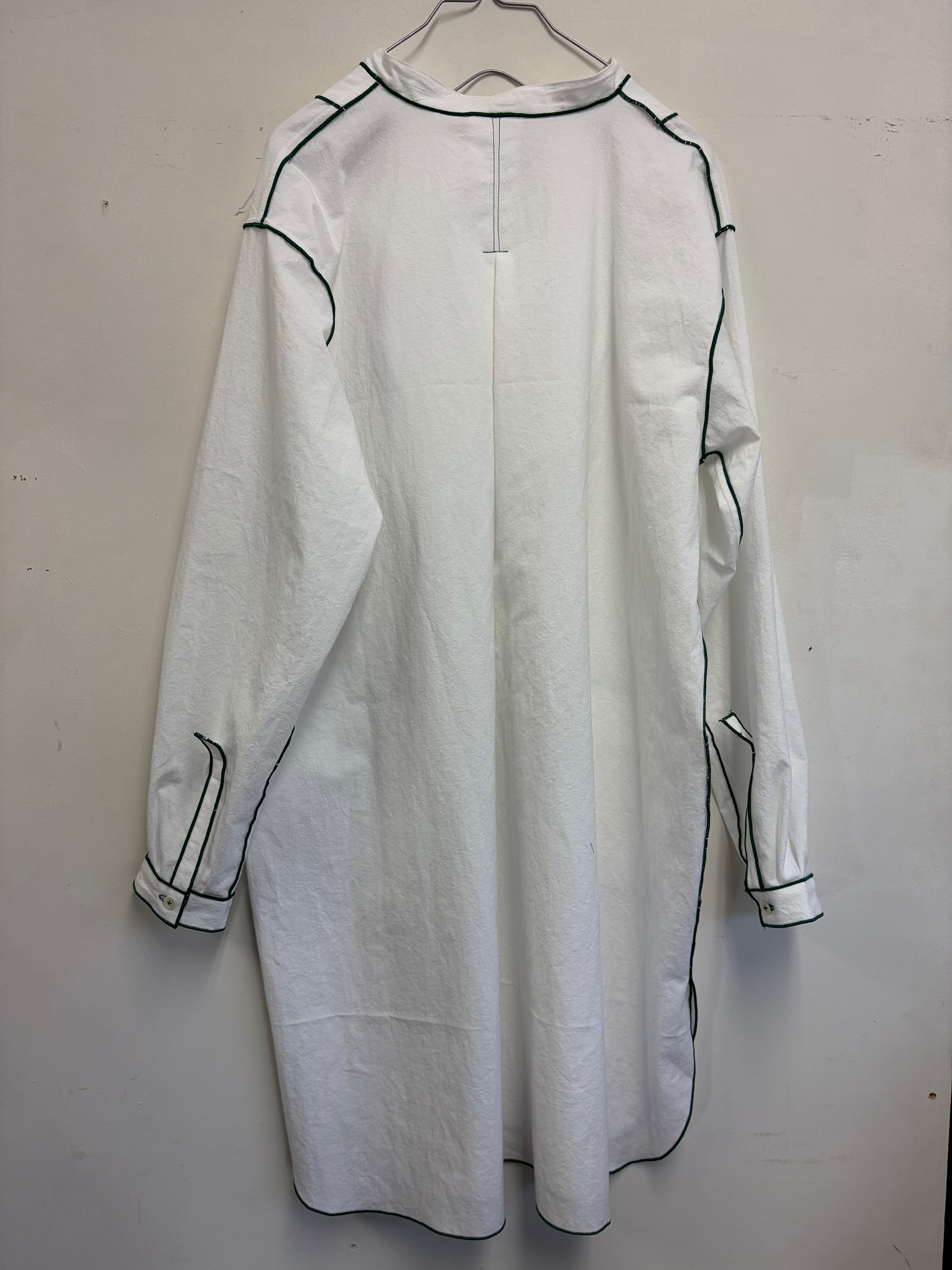 膝丈のロングシャツぐるりと縁取りました 絵の中から飛び出したようなシャツになりました。 後ろにタックを入れたのでゆったりとした着心地となっています。 縁取り 緑 素材 コットン サイズ 着丈90cm 裄丈80cm 身幅65cm 袖幅20cm 袖口22cm ボタンあり 襟ぐり48cm