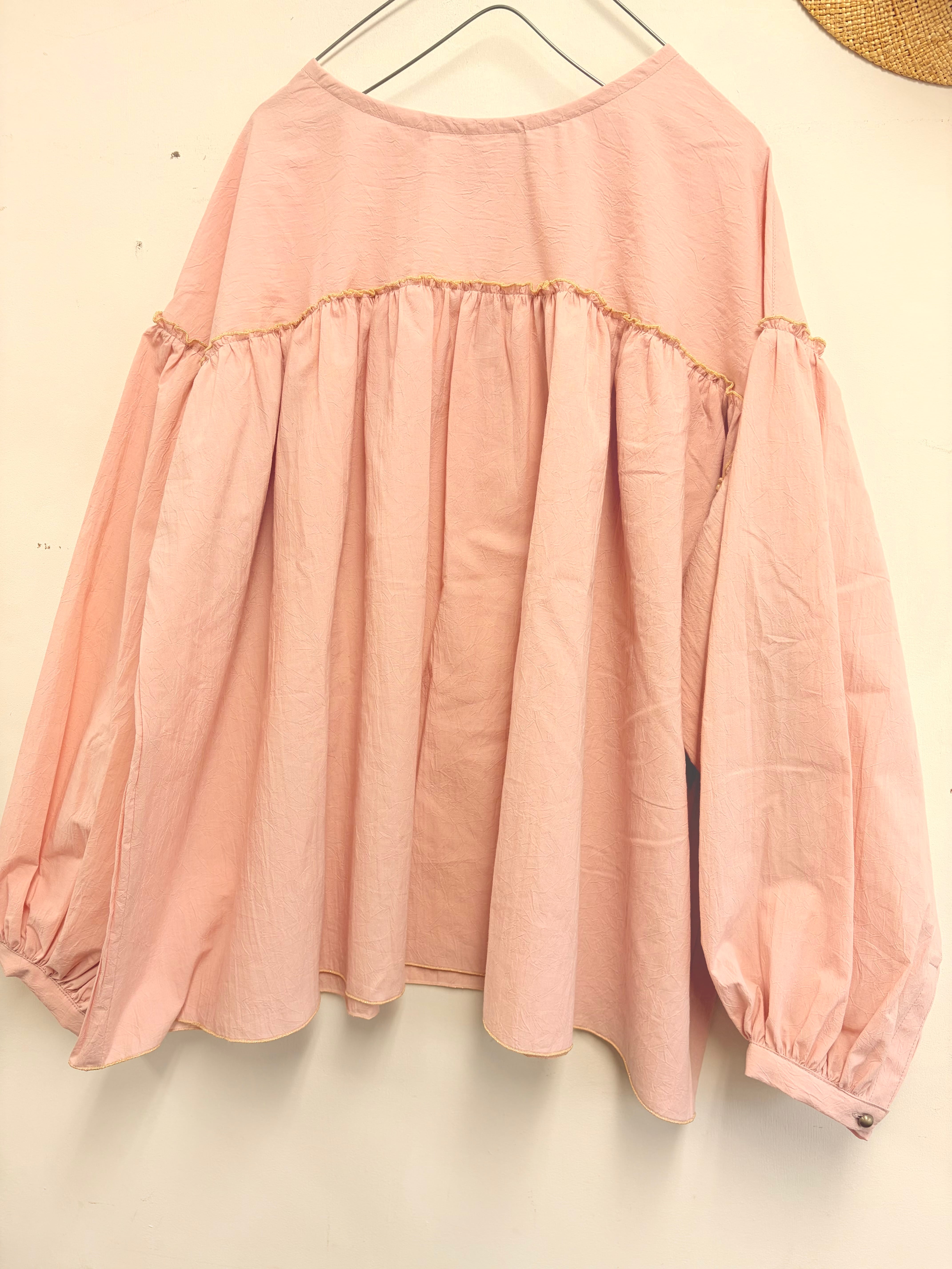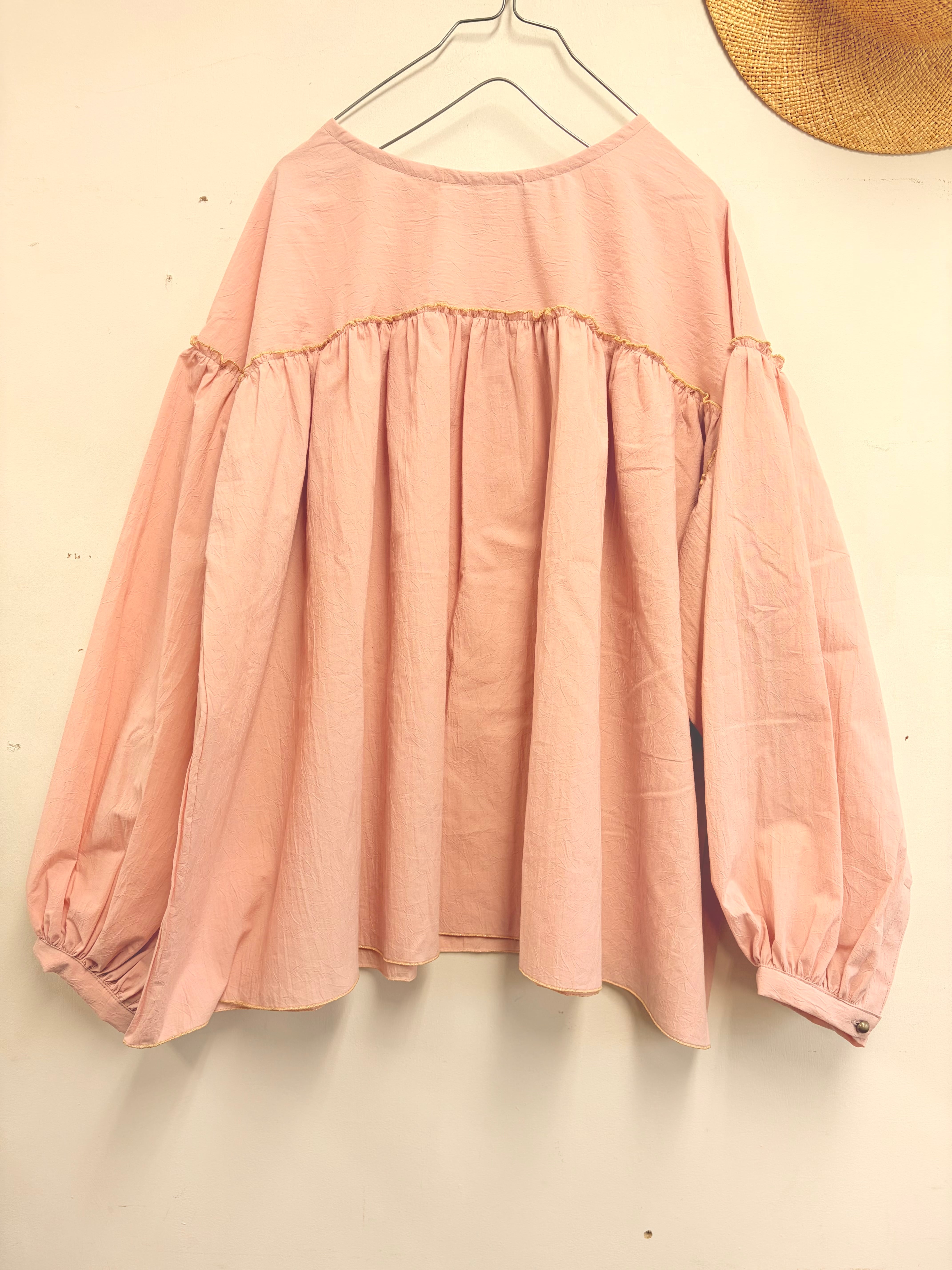 淡いピンクにゴールドの縁取のブラウスふんわりとしたロングスリーブ仕上げました。